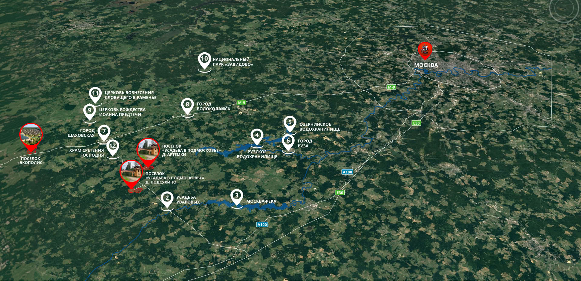 и лесов, на границе деревни Подсухино, в 150 км от Москвы по Новорижскому шоссе.